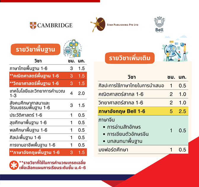 - ใช้ Cambridge Textbooks ในรายวิชา ภาษาอังกฤษพื้นฐานและเพิ่มเติม คณิตศาสตร์สากล และวิทยาศาสตร์สากล ใช้ตำราจาก Star Publishing Singapore ได้รับประกาศนียบัตร จบหลักสูตรในวัน BELL GRADUATION DAY