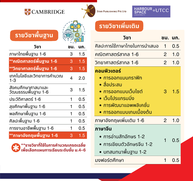 - ใช้ Cambridge Textbooks ในรายวิชา ภาษาอังกฤษพื้นฐานและเพิ่มเติม คณิตศาสตร์สากล และวิทยาศาสตร์สากล ใช้ตำราจาก Star Publishing Singapore