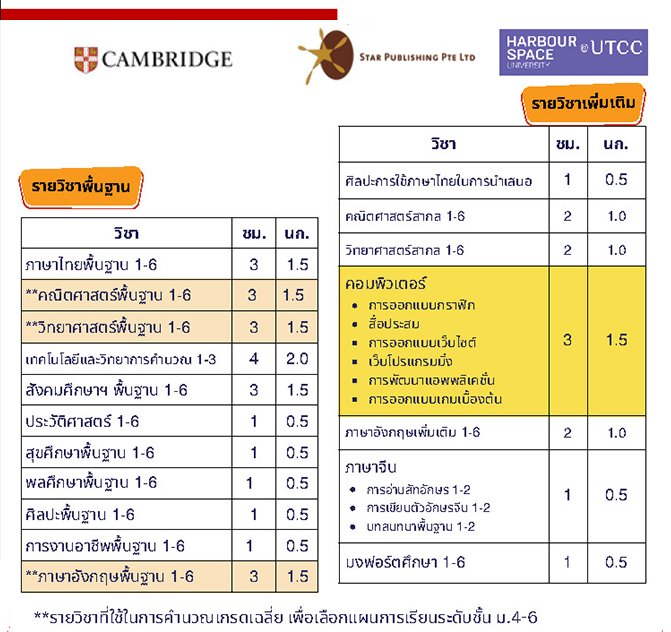 - วิชา คณิตศาสตร์สากล และวิทยาศาสตร์สากล ใช้ตําราจาก Star Publishing Singapore