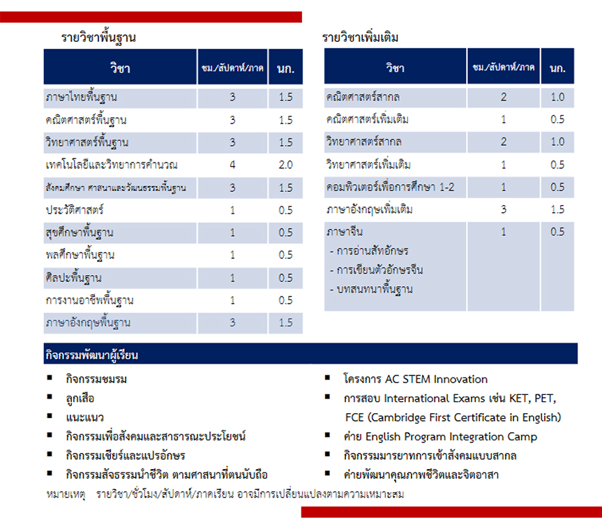 สาระการเรียนรู้พื้นฐานและเพิ่มเติม เรียนกับคุณครูเจ้าของภาษา ยกเว้น วิชาภาษาไทย สังคมศึกษาฯ และศิลปะรายวิชาเพิ่มเติมที่แตกต่าง